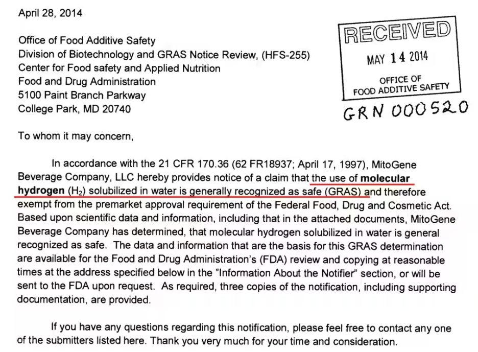 美國 FDA 2014年正式將氫氣作為食品添加劑列入 GRAS 等級,資料來源:美國FDA網站